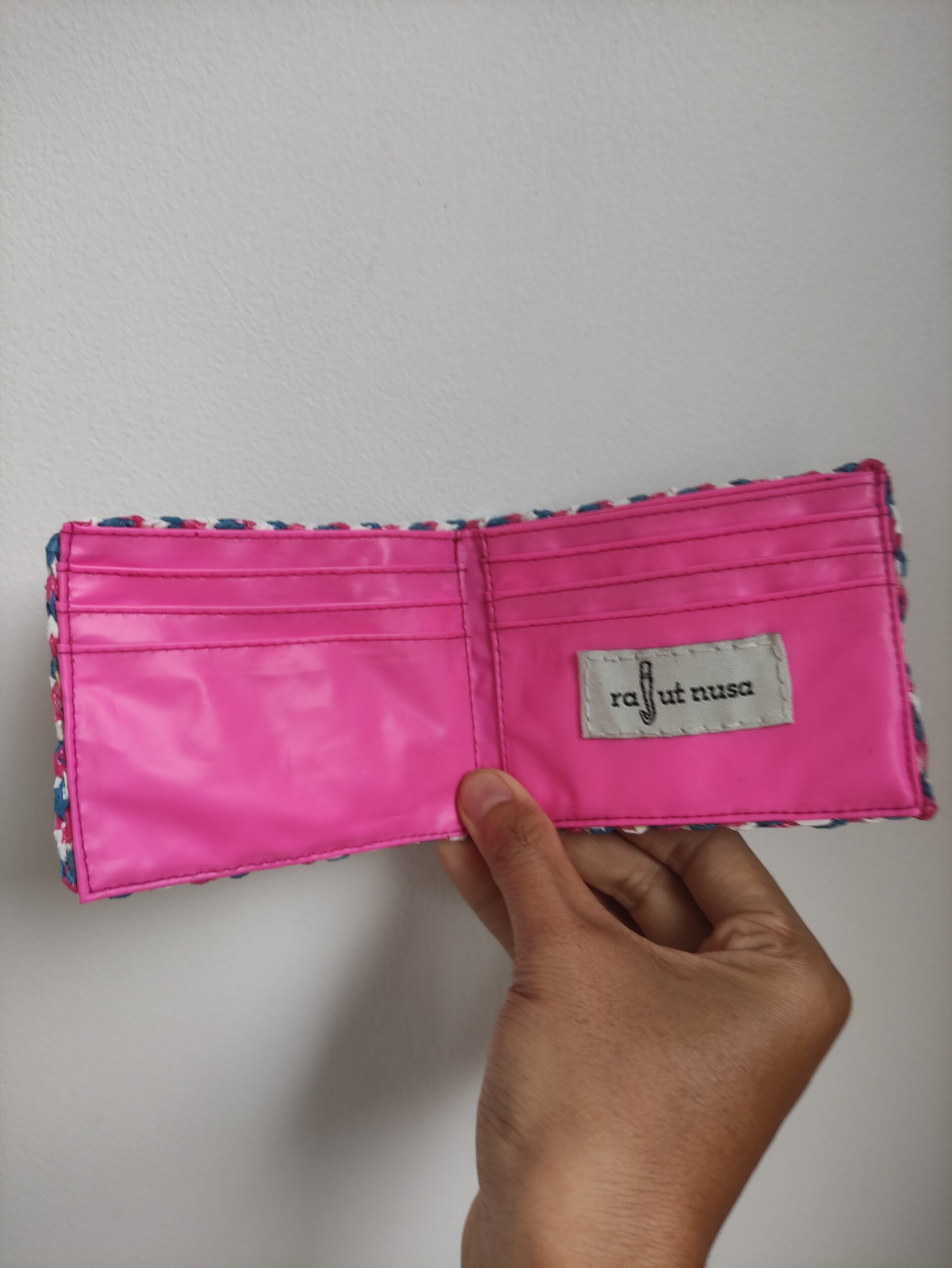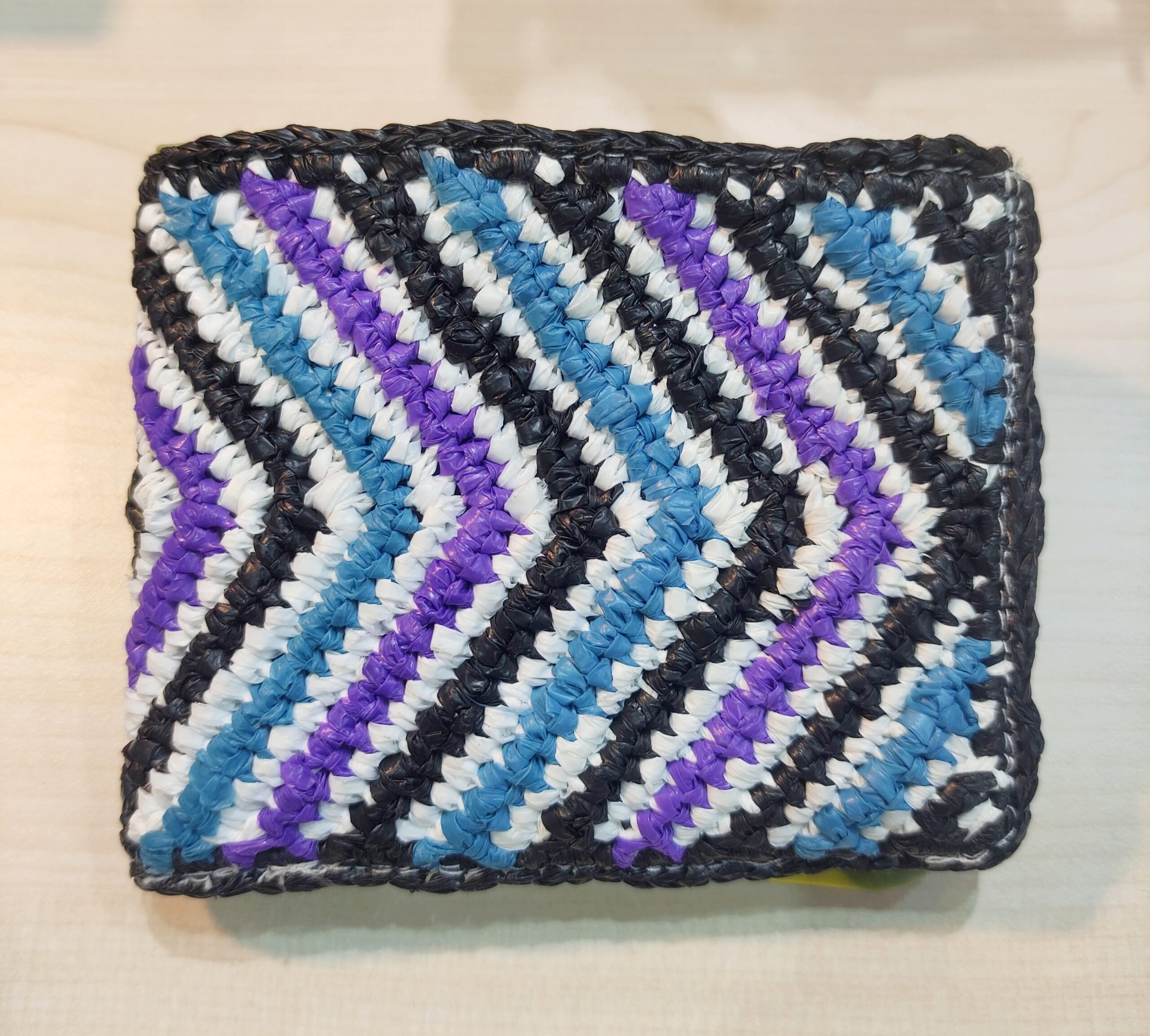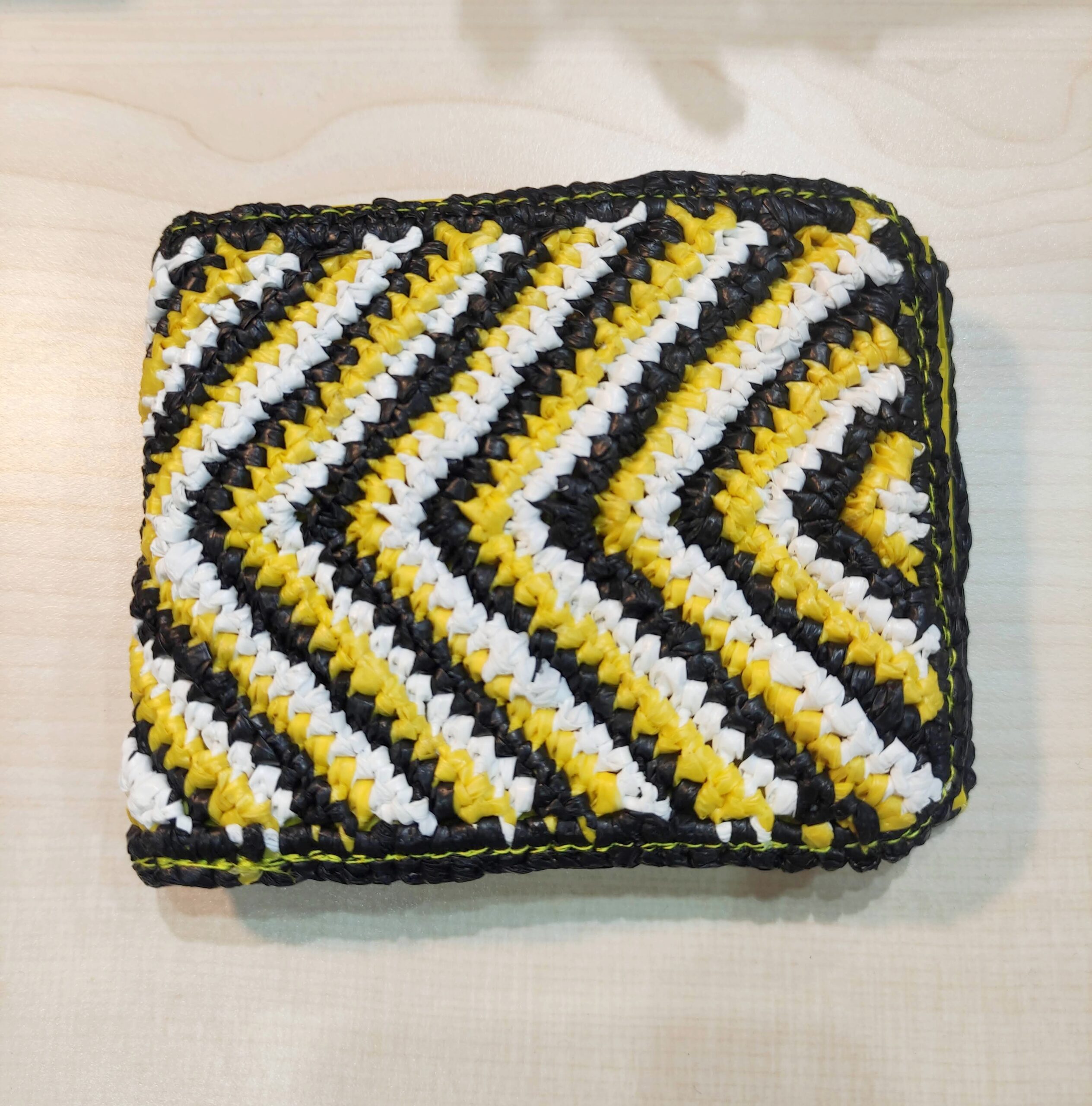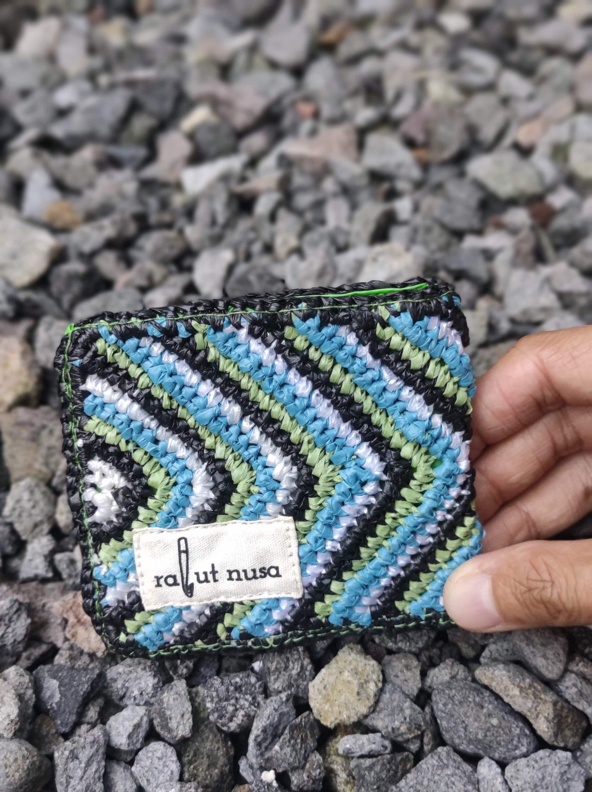 A slim, functional wallet designed with slots for cards and banknotes. The outer layer is crocheted from recycled plastic bags, while the inside is lined with repurposed floaties and raincoat material — giving waterproof durability a second life.